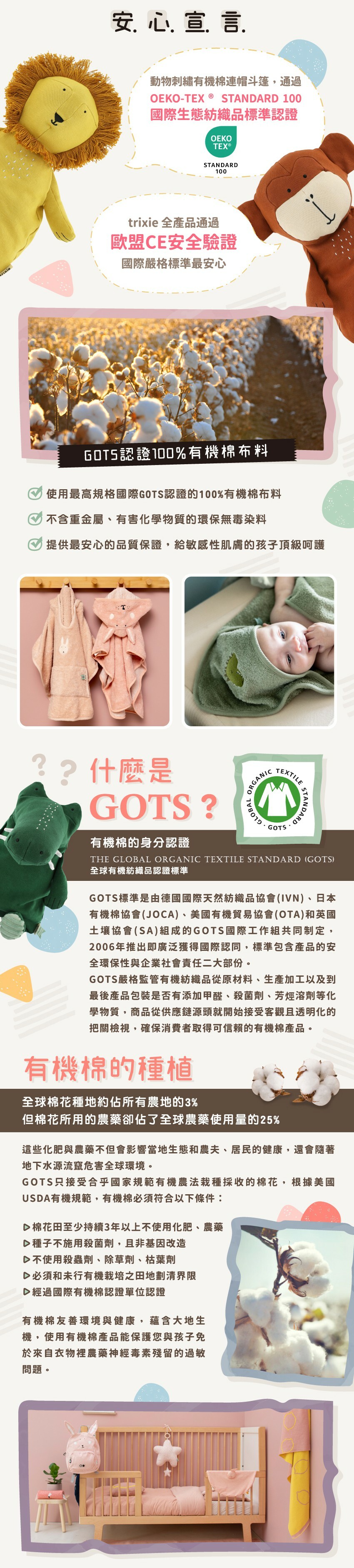 ● 表布為100%國際認證GOTS有機棉料,吸水力佳