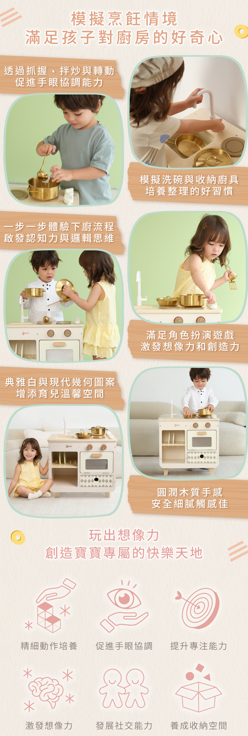 ● 透過抓握、拌炒與轉動,促進手眼協調能力