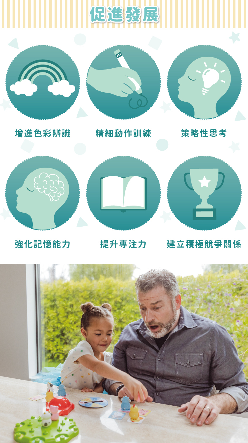 ● 色彩繽紛的遊戲配件,增進視覺刺激與辨識力