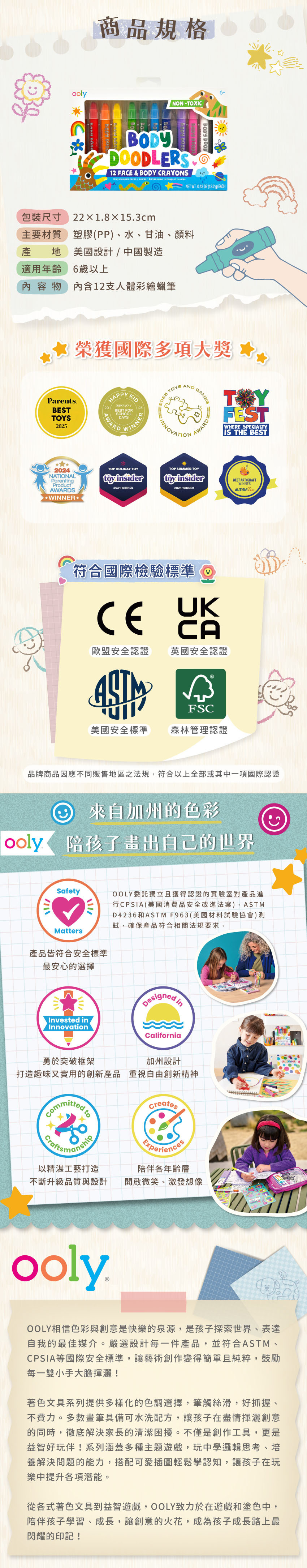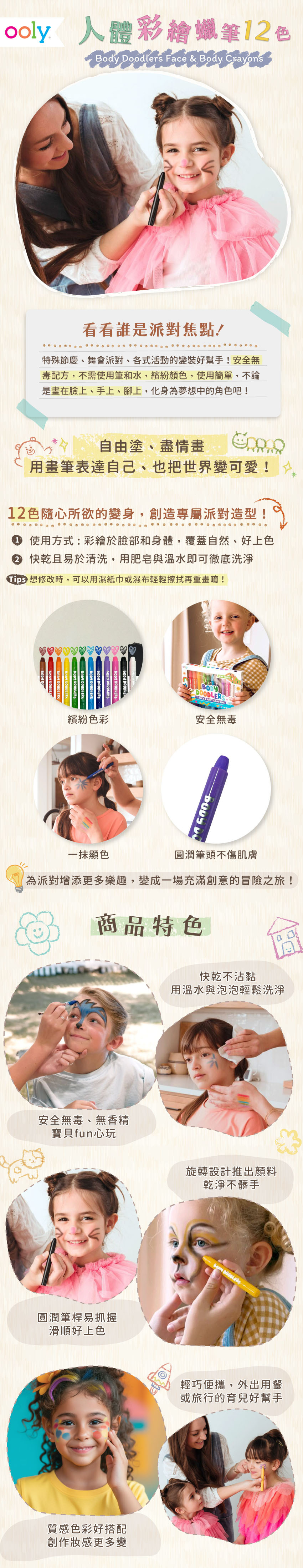 ● 12色人體專用彩繪蠟筆,安全無毒配方