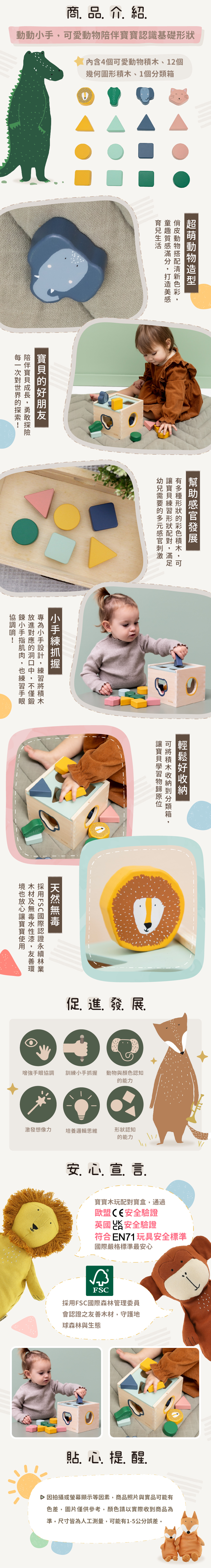 ● 內含4個動物積木、12個幾何積木與1個分類箱