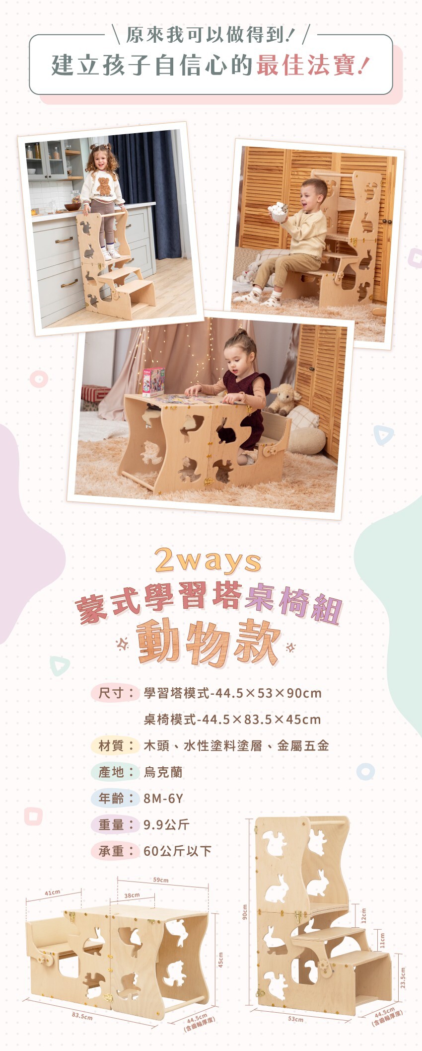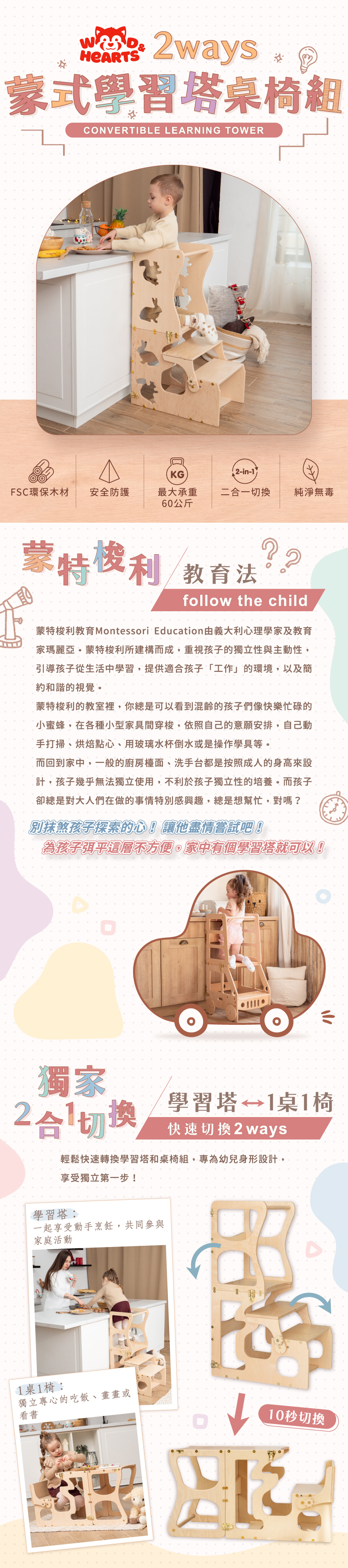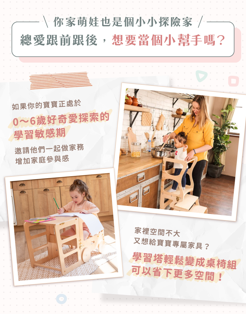● 2合1切換,輕鬆轉換為學習塔和桌椅