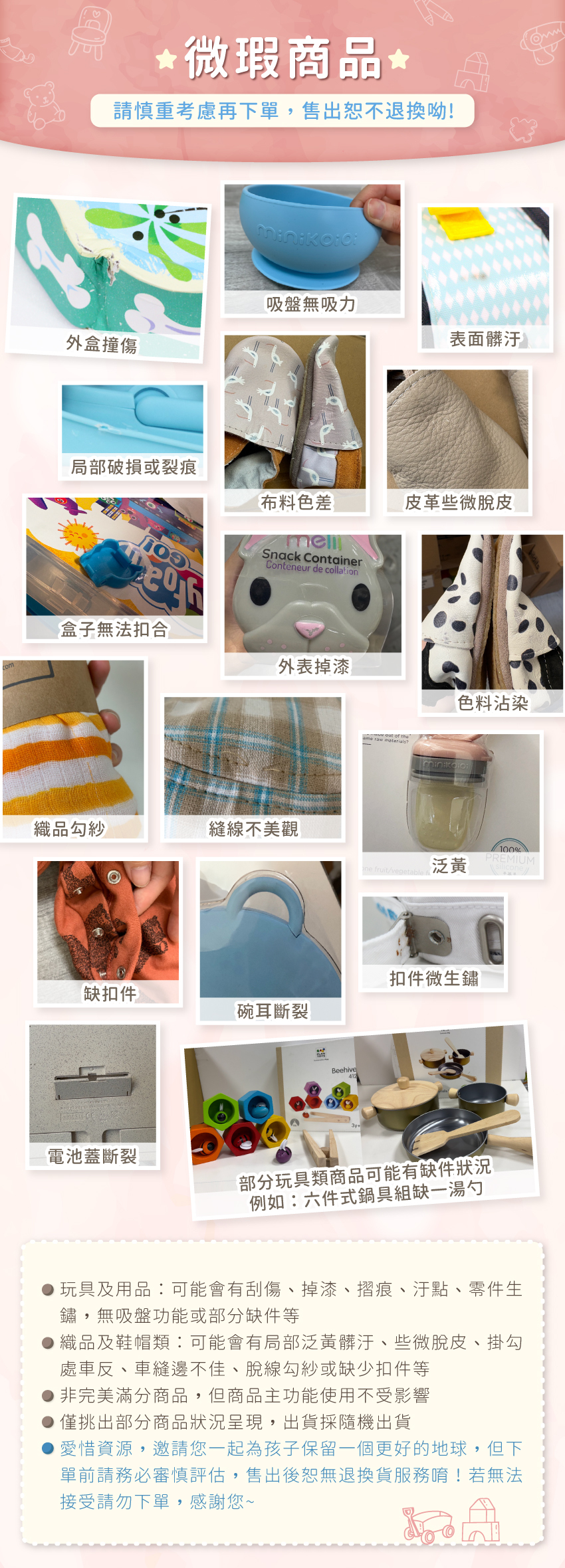 ▶微瑕特賣商品不是滿分商品,故以特惠價惜物出清,皆可能有部分摩擦受損、脫模不美觀、局部破損、髒污或缺件等情況,但不影響商品主要使用功能,下單前請務必審慎評估,售出後恕無退換貨服務。